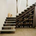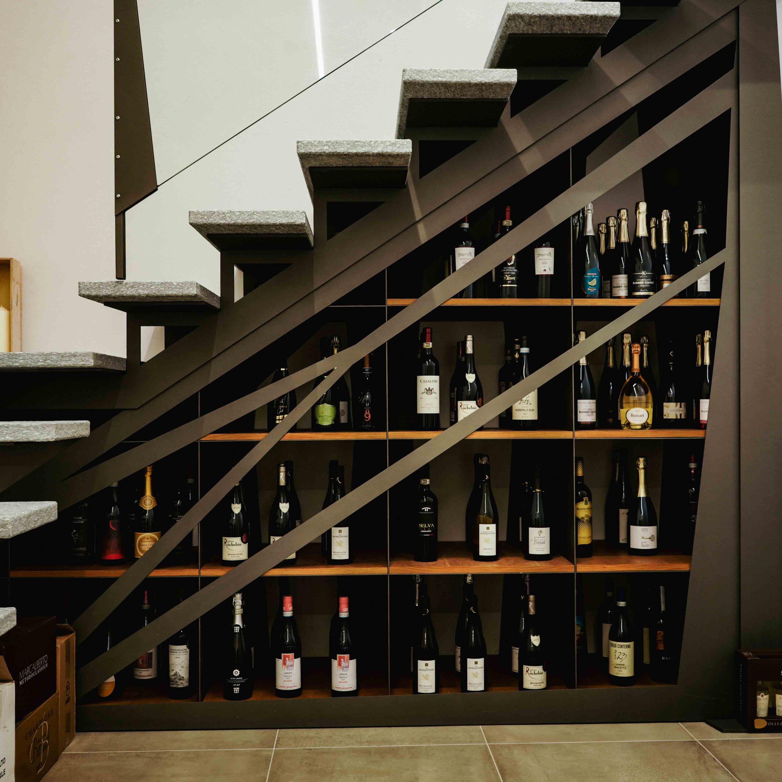 Quella che vedi è una suggestione di progetto: una cantina sottoscala realizzata in Rovere massello e ferro verniciato, pensata per sfruttare al massimo un vano spesso inutilizzato.