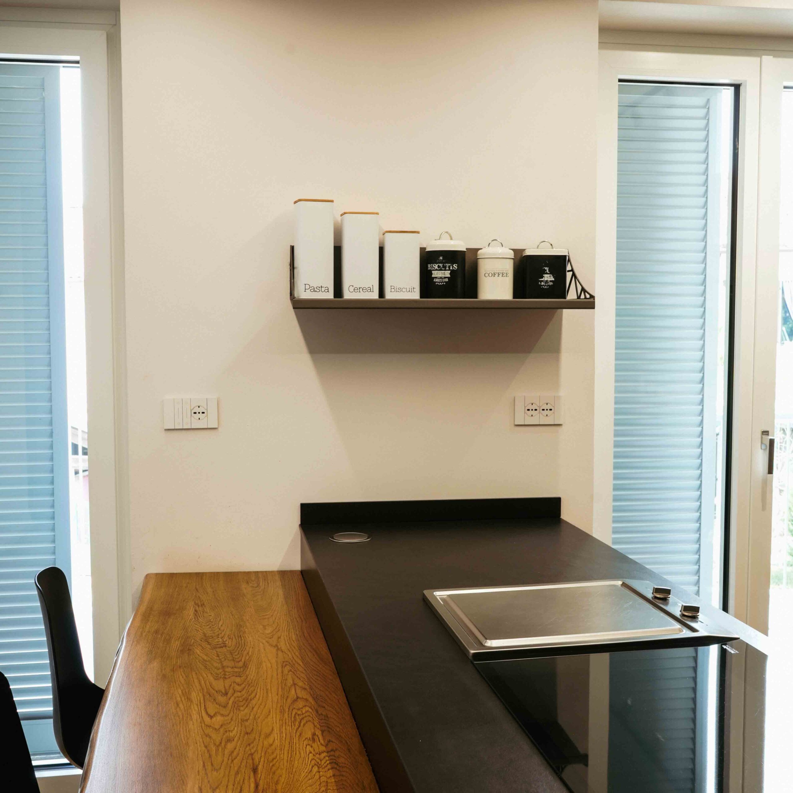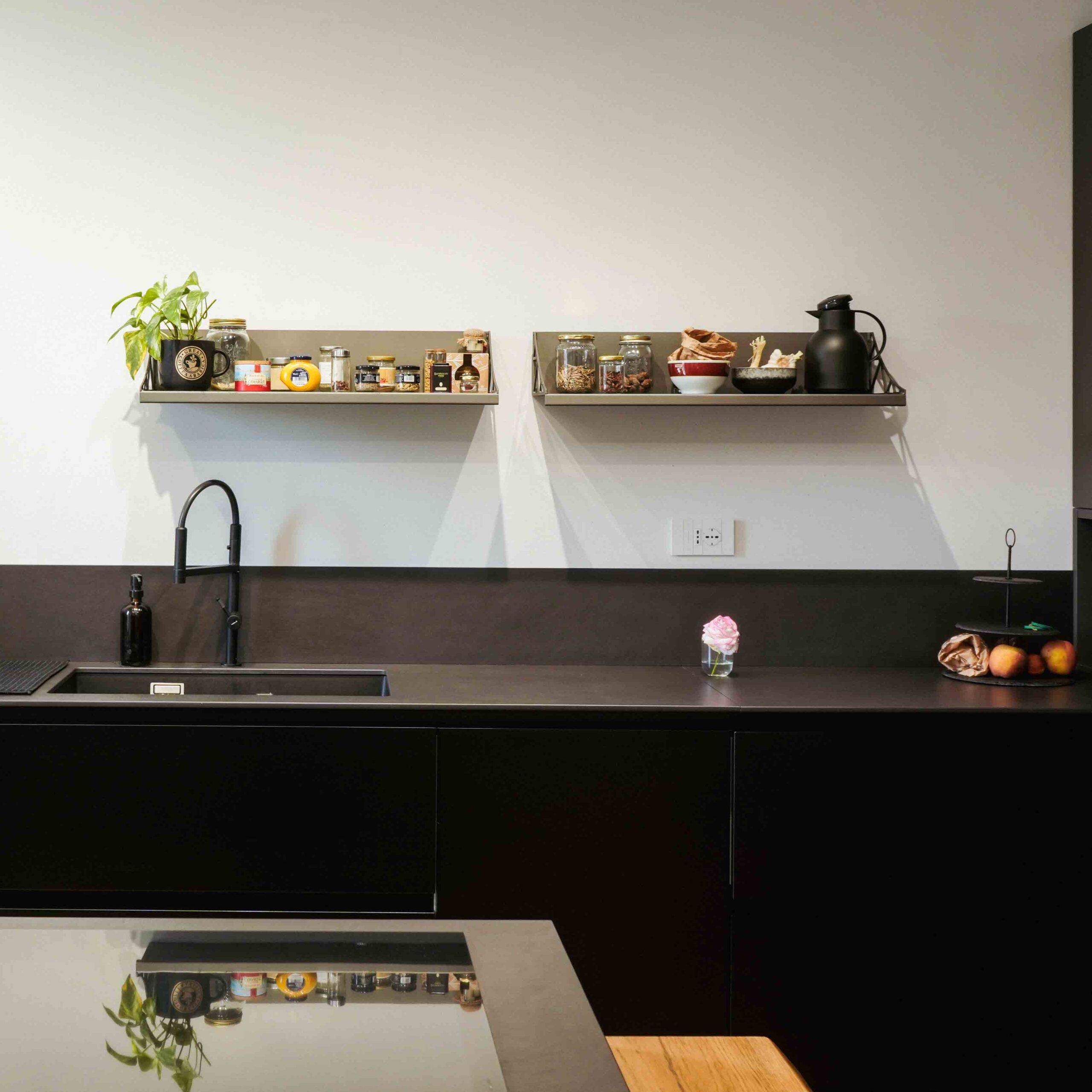 Il risultato è una mensola solida e scenografica che porta carattere industrial in cucina, living o studio, senza rinunciare alla pulizia delle linee.
